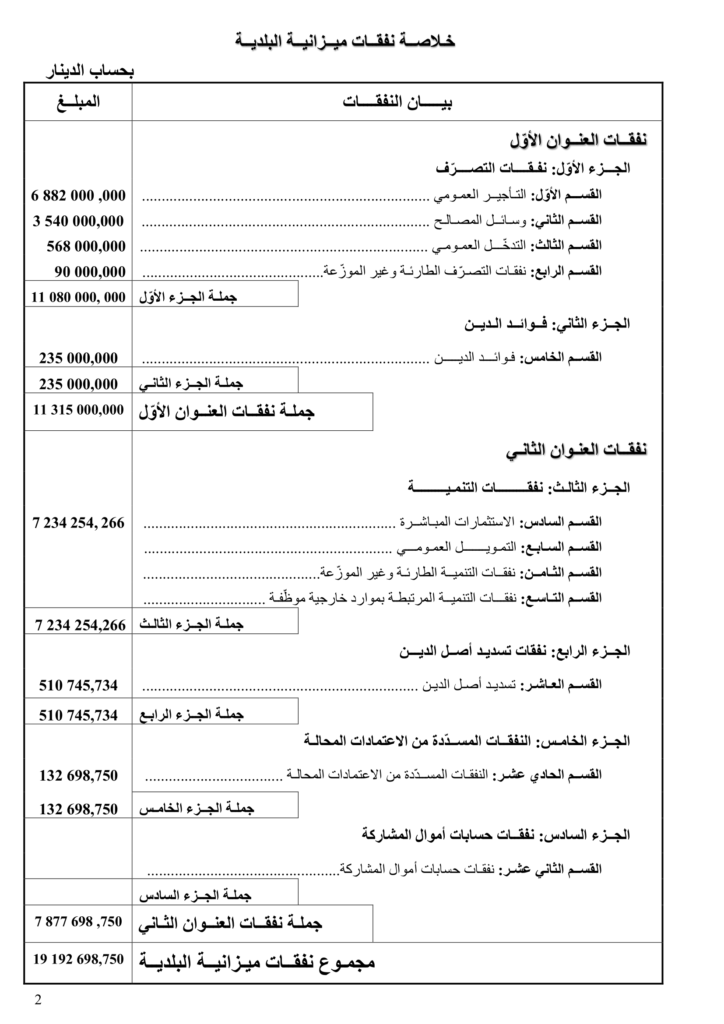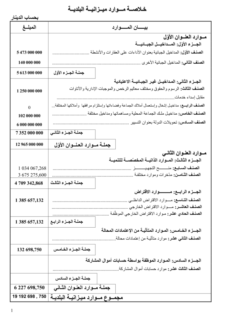 ميزانية سنة 2025 تطرح بلدية سيدي حسين للعموم ميزانية البلدية لسنة 2025 دخلا و صرفا المصادق عليها من قبل السيد والي تونس بتاريخ 2024/12/25 1- تعريف الميزانية الميزانية وثيقة قانونية يتم بمقتضاها ضبط تقديرات جملة الموارد والنفقات والترخيص فيها لمدة سنة 2-تقرير اعداد مشروع ميزانية سنة -2025 في نطاق اعداد ميزانية سنة 2025 نطرح لكم التقرير ( انقر هنا ) المحوصل لاهم خصائص ميزانية سنة 2025 3- المصادقة على ميزانية سنة2025 من طرف اللجنة الادارية تمت المصادقة على ميزانية بلدية سيدي حسين لسنة 2025 من قبل المجلس البلدي بتاريخ 2024/11/14( الاطلاع على محضر المداولات ) 4- حوصلة ميزانية سنة 2025 في ما يلي حوصلة لميزانية سنة 2025 المصادق عليها مفصلة حسب الاجزاء و الصنف موارد و نفقات عنوان اول و عنوان ثاني تقديرات الموارد لسنة 2025 تقديرات النفقات لسنة 2025 5- تحميل ميزانية سنة 2025 تطرح لكم بلدية سيد حسين ميزانية سنة 2024 لاطلاع و التحميل في صيغة pdf كما تجدونها ضمن ركن البيانات المفتوحة في صيغة xcls تحميل ميزانية سنة 2025 في صيغة pdf 6- جداول بيانية لميزانية سنة 2025 تطرح بلدية سيدي حسين عدد من الرسوم البيانية التي تسطر خصائص ميزانية سنة 2025 1- هيكلية موارد و نفقات ميزانية سنة 2025 هيكلية موارد ميوانية سنة 2025 Loading.......... The Data is Not Available هيكلية نفقات ميزانية 2025 Loading.......... The Data is Not Available