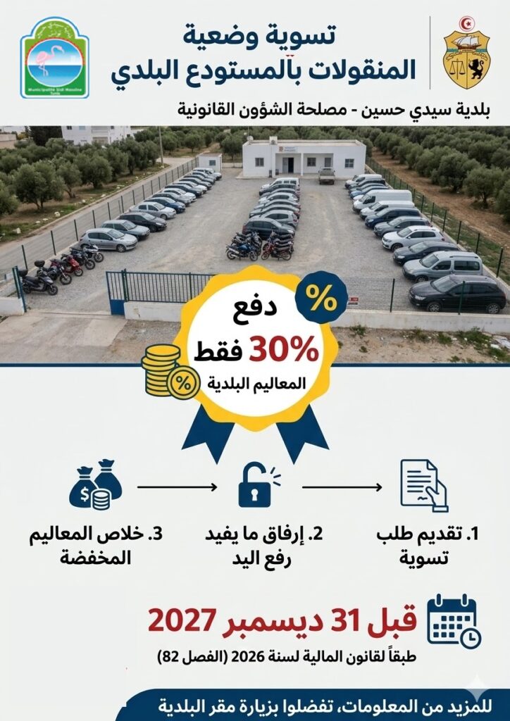 تعلم بلدية سيدي حسين كافة المواطنين المعنيين بوجود عربات أو منقولات تابعة لهم بمستودع الحجز البلدي، أنه تقرر فتح باب التسوية الاستثنائية وفقاً للفصل 82 من قانون المالية لسنة 2026.